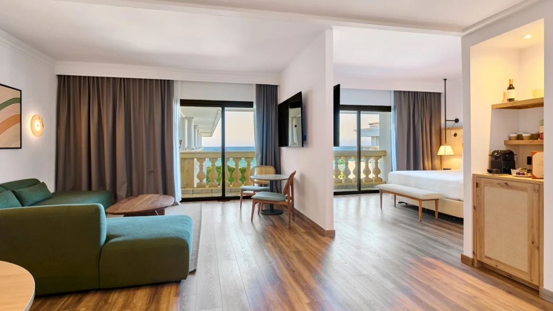 Alle Zimmer verfügen über: Kingsize-Bett oder zwei Einzelbetten, Klimaanlage, 55-Zoll-Smart-TV, Bademäntel und Hausschuhe, Gepäckablage, Bügeleisen mit Bügelbrett (vollständig mit Bezug), Dampfbügeleisen auf Anfrage, Haartrockner, Safe, Wecker mit Bluetooth-Lautsprecher, Minibar (gegen Aufpreis), Wasserkocher sowie Kaffee- und Teezubereitungsmöglichkeiten, Telefon. 1 Bedroom Suiten mit separaten Schlaf- und Wohnbereichen. Zusätzlich in den Suiten: Waage und Strandtasche. Zimmergrössen: Doppel Deluxe 32 m², Junior Suiten 86 m², Junior Suiten seitl. Meersicht 80 m², Junior Suite frontale Meersicht 63 m², Suite frontale Meersicht 86 m².